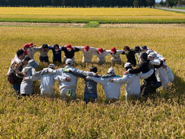稲刈り当日は快晴の中、同校農業科学科水稲班の生徒十四人とプロジェクトの参加企業から十一人が参加。四つのチームに別れて収穫作業を行った。