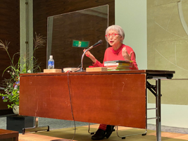 講演会には会場が満席となる約三百人が参加。角野さんが登場すると大きな拍手が鳴り響いた。講演で角野さんは、自身の体験を基に書いた作品の裏話や、戦時中の体験談をユーモアを交えて話し、会場を沸かせた。最後に、現在建設中で二三年十一月に東京都江戸川区に開館予定の「角野栄子児童文学館」について話し講演を締めくくった。(工藤森)