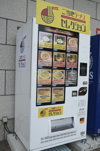 「ご当地ラーメンセレクション」と、名付けられた自動販売機には、ミュシュランガイドで紹介された店をはじめ、有名店のラーメンが勢揃い。東京から、特みそこってりの「東京スタイルみそらーめん ど・みそ」、海苔が十枚入った「吉祥寺武蔵家の家系MAX」、新宿の行列店「すごい煮干ラーメン凪」、芳醇鶏醤油らぁめんの「カネキッチンヌードル」に、千葉の二十五個入り「雷神餃子」(千葉)など。