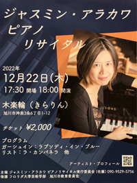 旭川出身で様々な国で活躍するピアニスト、ジャスミン・アラカワのピアノリサイタルが二十二日(木)午後六時から、木楽輪(神楽三ノ六)で開かれます。