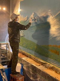 内覧会では、浴室の壁に新たな「絵」を描くため、東京から銭湯絵師の田中みずきさんを招へい。壁に設置された、縦一・八×幅三・六㍍のアルミ複合版をキャンパスに、大雪山連邦の絵を描く姿が公開され、内覧会参加者からの熱視線を受けながら完成の瞬間を迎えた。