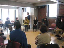 参加者は話し手の顔が見えるよう、輪状になって座り、子どもの就学に関する市教育委員会との対応の仕方や子育てに関する悩みなどを出し合い、一木さんや参加者たちから意見を聞いた。