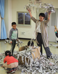 今回は、新聞紙を活用して遊ぶ企画。昔ながらの紙鉄砲を作って大きな音を鳴らしたり、かぶとや剣を作ったり、細く裂いた新聞紙で「新聞風呂」を作ってその中に埋もれたり。子どもたちは大人の助けを借りて、思い思いの遊びを楽しんだ。中には、足元に敷いた新聞紙をジャンケンで負けるたびに半分に折っていき、足がはみ出したら負けというゲームを自主的に始める子どもたちの姿も。