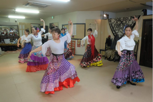 山崎由美子エルモラード・フラメンコスタジオの出演は十二回目。練習スタジオでは、本番に向けて熱心な練習が続いています=写真。