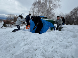 髙砂酒造(宮下十七)の蔵人たちが十八日、美瑛町美馬牛の山中で、雪の中から原酒を入れたタンクを掘り出す作業に汗を流した。