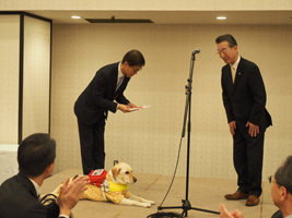 PR犬のグレン君を連れて贈呈式に訪れた和田孝文・道盲導犬協会所長は、「長きにわたりご支援いただき、心からお礼を申し上げます。今年の冬まつり会場で行われた募金イベントでは、たくさんの募金が集まっただけでなく、市民が盲導犬と触れ合うことができ、盲導犬への理解が深まった二日間でした。今年も一頭でも多くの盲導犬を育成できるよう頑張りたいと思います」と、お礼の言葉を述べた。(岡本成史)