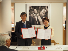 締結式の中で田中館長が「学生の文学離れが進む中、私たちに何ができるのか考え、大学と協力して地域に貢献できれば」。三上学長が「学校を卒業しても一生勉強という時代。三浦文学をきっかけに読書に興味を持つことができれば、生涯を通じての学びに有効だと思う」と話した。