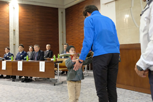 北星・江丹別地区除雪センターの加藤勇二センター長による安全宣言の後、くりの木幼稚園の千代陽斗くん(5)が、「体に気を付けて、除雪の仕事を頑張って下さい」と、事業者らに安全運転のお願いをして会を終えた。(東寛樹)