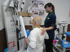 現在、六十代から九十代の高齢者が利用している。利用時間は午前九時からと、午後一時半からで、それぞれ三時間十五分。リハビリ開始前にバイタルチェックで血圧・脈拍・体温を測り体調を確認し、看護師が問診でトレーニングできるかどうか判断する。