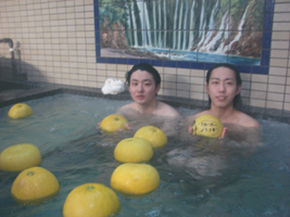 直径二十㌢ほどのボンタンが、男女の湯にそれぞれ十個ずつ。柑橘類独特の甘い酸っぱい香りが、ほんのりと浴場いっぱいに広がっている。