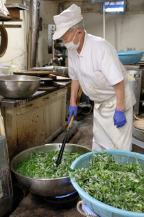 六月上旬までに、同店で一年間に使用するヨモギ約四百㌔を、近郊の山などで採取。手作業で雑草などを取り除いた後、釜ゆでし、ソフトボール大にまとめて冷凍保存される。