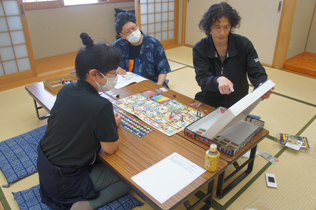ボードゲーム「逃走中&戦闘中」は、人気テレビ番組「逃走中」と「戦闘中」をテーマにしたもの。サイコロを振って出た目の数だけマスを移動し、それに応じて発生するミッションをクリアしながら遊ぶ。代表の池嶋さんが中心となり、遊び方を一つひとつ確認しながら進めた。