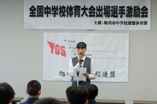 激励会には、選手をはじめ顧問の教諭らが出席。出場選手が紹介されたあと、代表して陸上競技の女子100㍍障害に出場する神居東三年・坂口仁心さんが「不安もありますが、これまでの練習を信じて自分の力を出し切りたい。努力を力に変えて、みんなで最高の結果をつかみましょう」と決意を述べた。