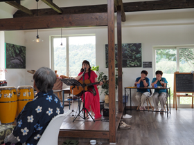 上川町にある南国風カフェ「ミナミカゼ」(東雲一五二三ノ一)で七月二十五日、シンガーソングライター・rikoさんの弾き語りが行われた。同店ではミニライブ「Teatime Music」を定期的に開いており、カフェ利用者は無料で楽しむことができる。