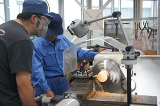 この日は、受講を検討している人やものづくりに関心のある人を対象に、①機械加工技術、②電気システム、③金属加工、④ビル管理技術の四学科の訓練を体験。機械工やマシンオペレータとして働くことを目指す機械加工技術科では、機械部品を加工する大型機械の「フライス盤」と「旋盤」を使った作業を行った。そのうちの旋盤は、円筒形の金属を加工するもので、材料を回転させて刃をあてることで、外径を削ったり、ネジ山を作ったりできる。