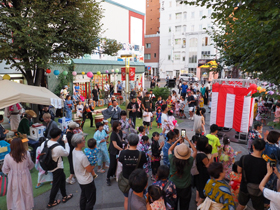 子ども盆踊りは、「シャンコシャンコシャンコ」でおなじみの「子供盆踊り唄」を太鼓の生演奏入りで、大人盆踊りは、「北海盆唄」を「三絃めじろ会」の三味線、太鼓、唄の生演奏で行った。後半の大人盆踊りでは、軽快な太鼓の音とのびやかな歌声が響く中、大人も子どもも入り乱れ、皆楽しそうに踊った。