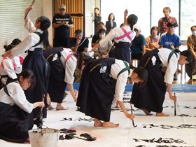 道立旭川美術館(常磐公園)で開催中の「魂の風景 山口正城と難波田龍起」展の関連イベントとして、十七日、旭川西高書道部による書道パフォーマンスが行われた。道教育委員会が「高校生等の美術館等利用促進重点期間」と設定する七月~八月に、身近で魅力ある場所として美術館に親しんでもらうことを目的に開催された。