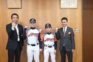 全国選抜軟式少年野球兵庫県大会(七、八日・淡路島)に、旭川少年野球の西地区選抜チーム「Asahikawa West」の一員として出場した鷹栖町在住の平出拓翔(鷹栖小六年)と、梁取哲平(附属旭川小六年)が十九日、鷹栖町役場を訪問。谷寿男町長と、鷲下正彦教育長に全国大会での成績を報告した。