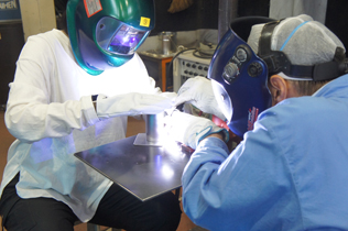 実習では、ペン立て作りに取り組んだ。ステンレス鋼の板に中が空洞の円柱を垂直に立て、接する個所を溶接する。間隔を空けて点状に溶接する方法で行った。