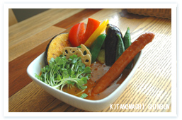 「たっぷり野菜のスープカレー」(九百円)にはジャガイモ、ニンジン、ナス、キャベツ、カボチャ、ブロッコリーなど合計十三種類の野菜が入ってい ます。谷さんいわく「これ一杯で一日分の野菜が摂取できますよ」。また、ご飯は白飯と黒米入りご飯の二種類から選べます。黒米入りはヘルシーさが人気で、 女性は圧倒的にこちらを選ぶそうです。