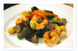 おすすめの一品「神居XO醤(じゃん)とエビの炒め」(八百八十円)=写真(左)=は、たっぷりのエビとブロッコリー、フクロタケ、クワイ、ギンナンなどの野菜を特製のXO醤で炒めた一皿。プリプリのエビの食感とそれぞれ違った歯ごたえの野菜が上品で芳醇なソースと絡み、口の中に広がります。