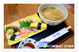 ランチタイムはそうめんが付いたセットメニューが人気です。生寿しセット、生ちらしセット、天丼セット、豚丼セットなど、どれも千円です。「お昼どきはご近所さんやはるばる車で遠くから来てくれるお客さんもいるんですよ」と笑顔で話すご夫婦でした。