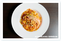 それでは、ランチメニューで人気の「海老とトマトのクリームパスタ」(ミニサラダ・スープ付き、八百三十円)をいただきます。