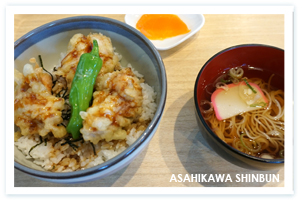 人気は、昼時のみ提供の日替わりランチ(五百円)。僕が訪れた日は、鳥天丼とミニそうめん。やわらかく、ジューシーな鳥天ぷらに甘辛いたれがかかって、ご飯がどんどん進む。ボリュームも満点だ。