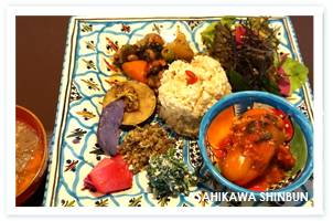 いわゆるヴィーガン(完全菜食主義)料理というと、いくら健康にいいといわれても、味気なくておいしく感じられないのが普通。ところが、この店は美味しい。メニューも、タイ北部の名物カレーヌードル・カオソーイ(千百円)、西アフリカごはん(千二百五十円)、スパイスカレープレート(千三百五十円)、宇宙ラザーニャプレート(千二百円)と、名前を聞いただけでもワクワクしてくる。