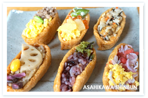 と言っても、提供するのは普通のいなり寿司ではなく、カラフルで味のバラエティーにとんだ飾りいなり。「彩りがあって、作る方も食べる方も楽しいでしょ」と横井さん。現在用意しているのは、カリカリ梅とジャコ、黒米と甘納豆、玉子と豚肉のそぼろ、そばの実ごはん、あさりごはん、数の子といくら(各一個百円)の六種。