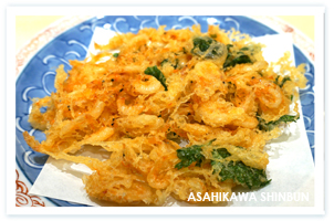 花まる亭の味を引き継ぎ、カボチャ団子のペロンタン汁など名物料理も残したものの、鷲見さんがメインにしたのは天ぷら。「最も奥が深く、最も食材の魅力を引き出すことのできる調理法だから」と鷲見さん。天ぷらにかける情熱は半端ではない。日本全国から選りすぐりの天ぷらなどの食材を集めるだけでなく、卵は餌や飼育環境にこだわった地場産、粉は道産と九州産を合わせ、天候によって衣の溶き方や空気の含ませ方を変える。油は太白胡麻油をベースに選び抜いた二種の油をブレンドし、これもその日の天候や気温によって配合を変える、水は自ら汲みに行く東川の湧水…といった具合。